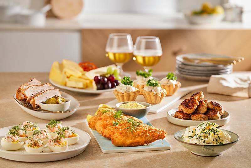 • Paneret rødspættefilet m/remoulade og citron • Æg og rejer • Tarteletter m/høns i asparges • Ribbenssteg m/agurkesalat • Klassiske frikadeller m/kartoffelsalat • 2 slags oste m/vindruer